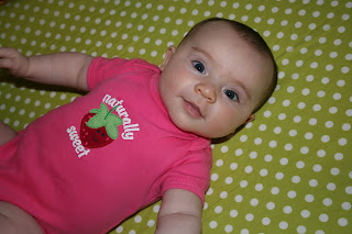 Looking pretty sweet in one of my cousins (lily and lexi's) old outfit. In other news, Eliana had her first laugh this past Saturday when Daddy made a really funny face. Mom and Dad were super excited, and also happy they both got to see her do it for the first time when they were together.